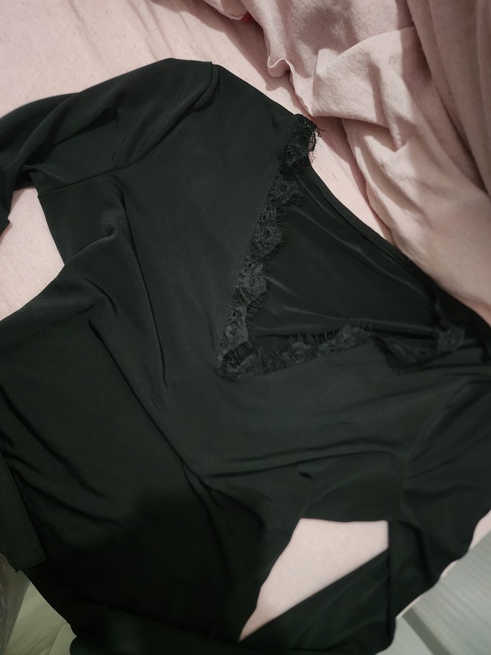 Satenimsi kumaştan, dantelli V yakalı, uzun kollu, siyah crop bershka