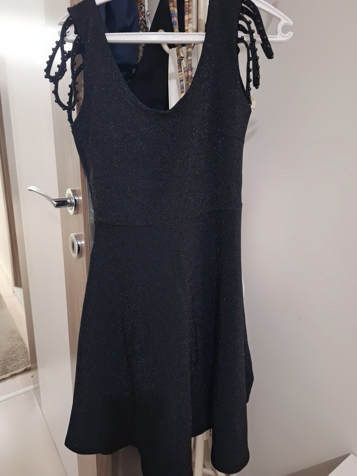 Siyah renkli, V yakalı ve kolsuz bu midi elbise, dantelli omuz detaylarıyla gotik tarzda, fit kesimdir ve parti için uygundur.