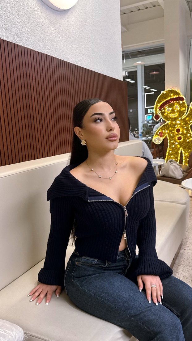 V yakalı, uzun kollu, kısa kesim siyah denim kazak, günlük kullanıma uygun, cesur ve şık bir sokak stili sunar.