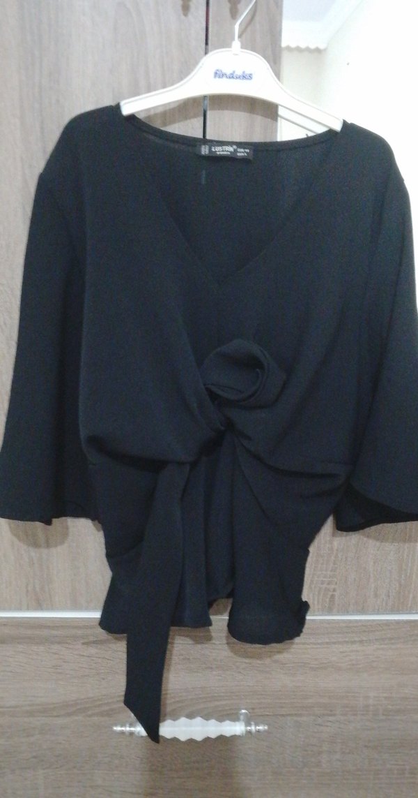 Siyah renkte, V yakalı ve uzun kollu kadın bluz. Drapeli ve bol kesim, kısa boyda, sentetik kumaştan üretilmiştir. Ofis ve günlük kullanıma uygundur. kurdale bağlanır