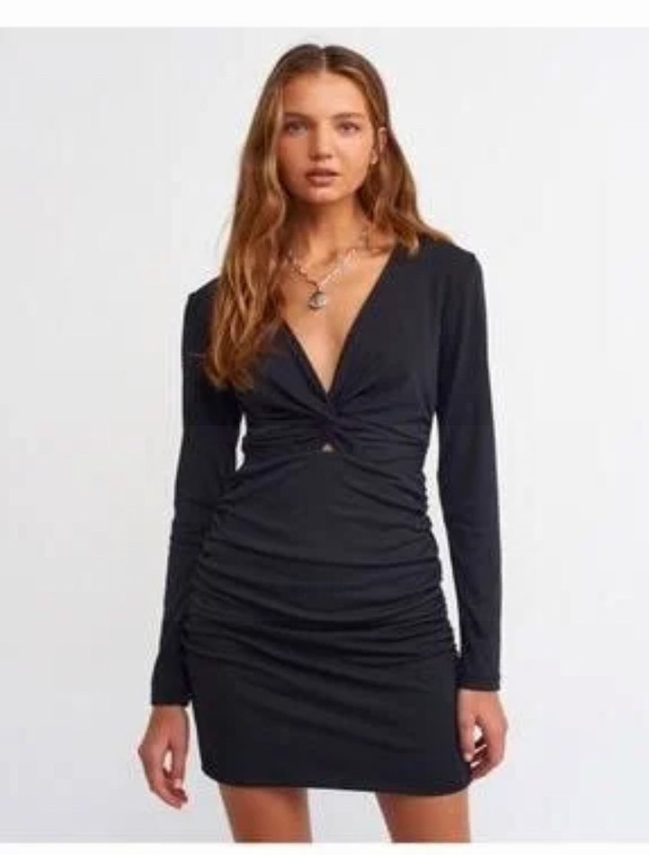 Siyah midi elbise, V yakalı ve uzun kollu olup, vücuda oturan kesime sahiptir. Drapeli tasarımıyla cesur ve minimal bir görünüm sunar. Pürüzsüz sentetik kumaştan üretilmiştir.