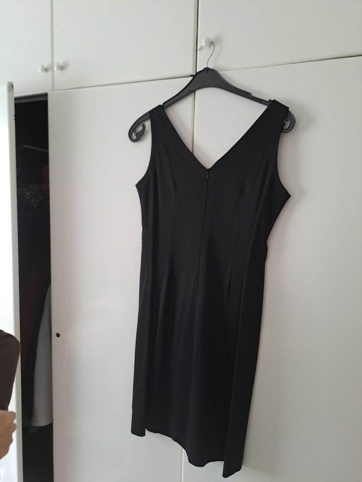 V yakalı, kolsuz ve drapeli detaylara sahip siyah, vücuda oturan midi elbise, gotik ve avangard tarz için uygundur. defermasyonu yok gayet iyi durumda. esnetilmeden olcusu iki koltuk alti arasi 48cm bel 41cm omuzdan asagi boy 98cm