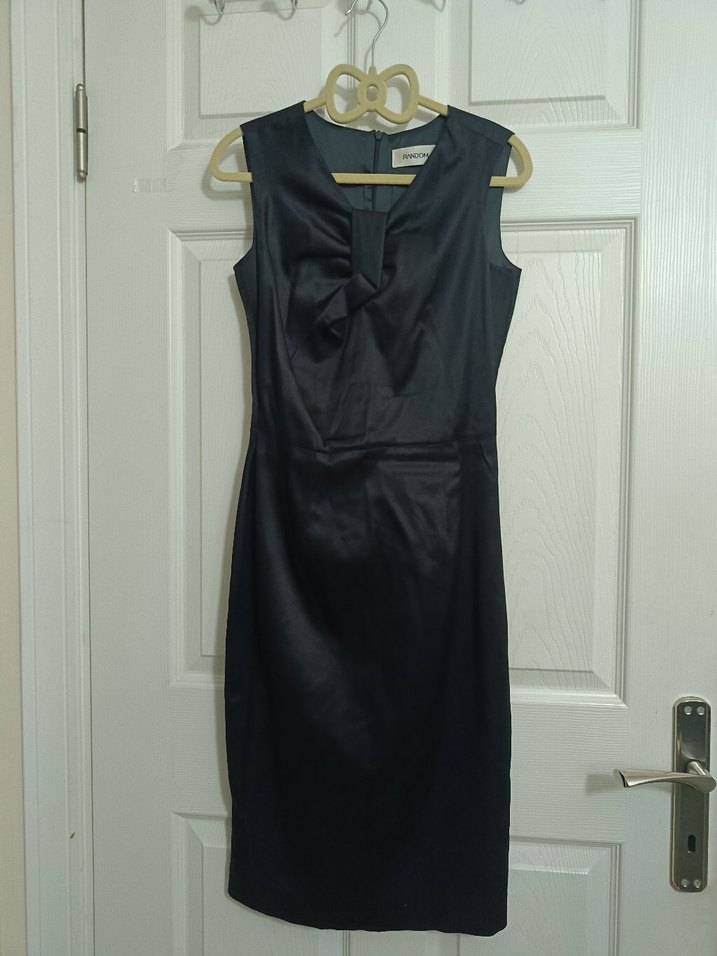 Kolsuz, V yakalı ve drapeli detaylı siyah midi elbise, klasik ve şık bir ofis görünümü sunar.