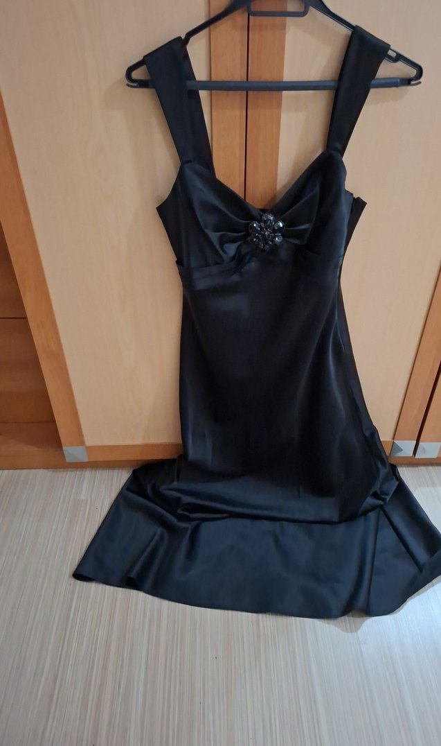 Siyah, v yakalı, kolsuz, drapeli detaylı ve çiçek süslemeli klasik gotik tarzda midi elbise.