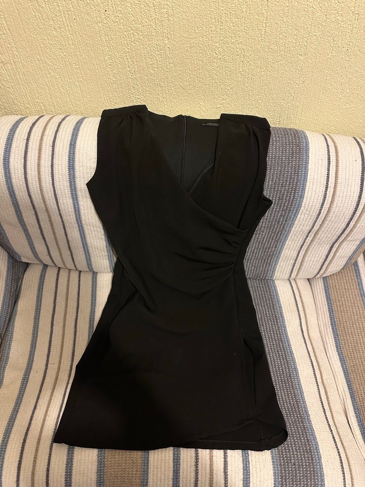 V yaka ve kolsuz, drapeli detaylı siyah, vücuda oturan midi elbise, minimalist ve avant-garde tarz için uygun.