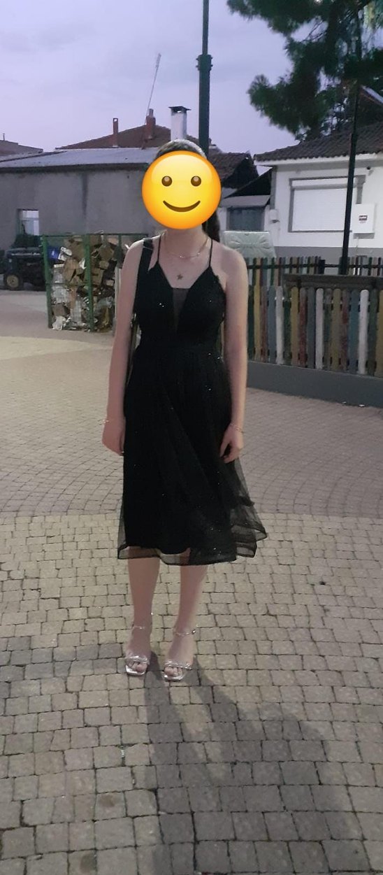 Siyah, v yakalı ve askılı kolları olan bu dar kesim midi elbise, drapeli tasarımıyla gotik parti tarzına uygundur. Koyu ve desensiz kumaşı avangart bir hava katar. Çok güzel sadece 1 kere giyildi simli ve batma yapmaz midi bir elbise modelidir.