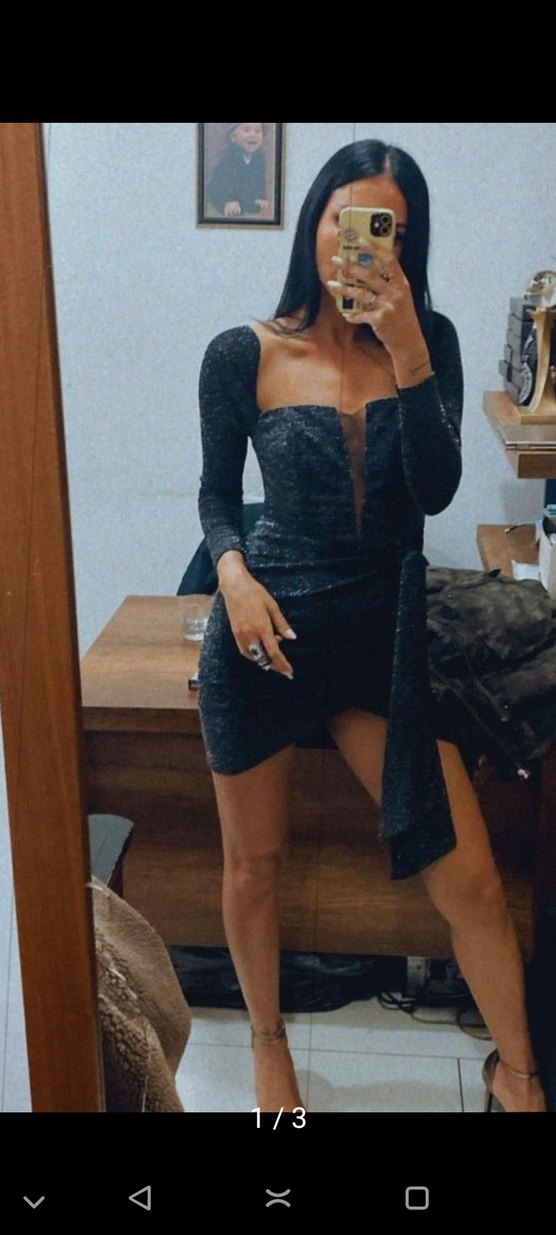 Bu dar kesim mini elbise, derin V yaka ve drapeli detaylara sahip. Koyu renk simli denim kumaştan yapılmıştır. Uzun kollu ve modern parti stilinde.