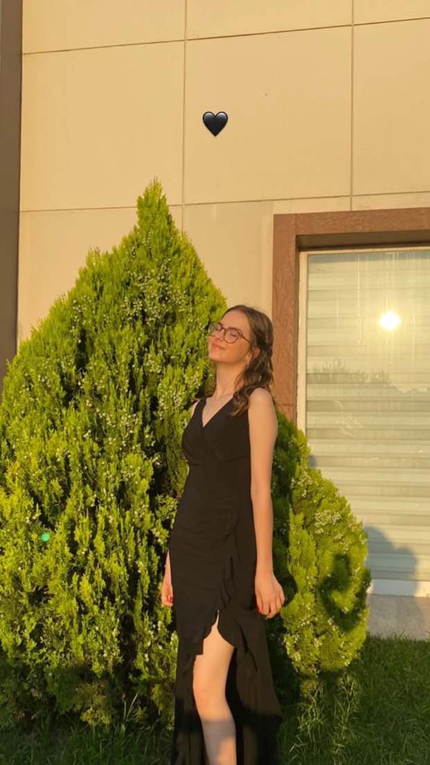 Siyah, v yakalı ve kolsuz uzun elbise, drapeli tasarımı ve ipeksi kumaşıyla ofis için uygun, klasik goth tarzında şık bir modeldir.
