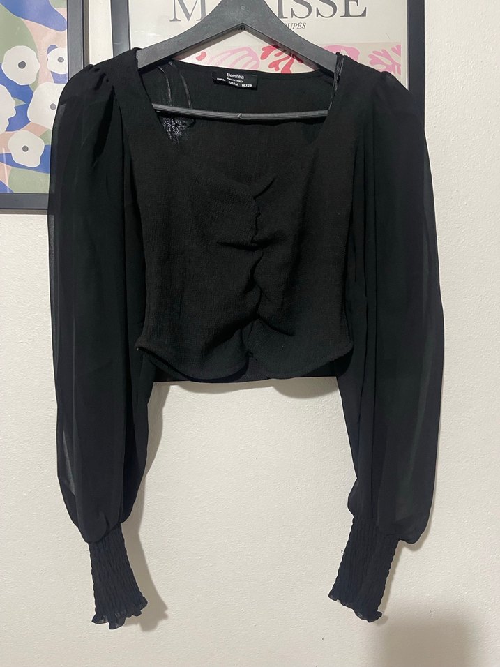 Siyah, v yakalı, drapeli ön detaylı, uzun kollu, vücuda oturan düz kesim bluz. Pürüzsüz sentetik kumaştan üretilmiştir.