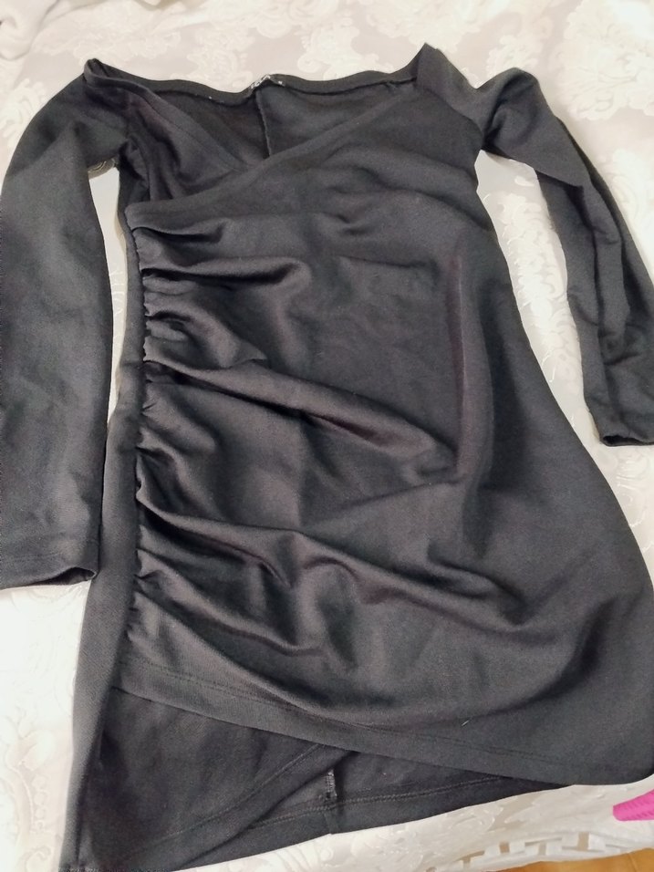 Siyah, v yakalı ve uzun kollu bu midi elbise, drapeli tasarımıyla minimalist ve avant-garde bir görünüm sunar. Moda tutkunları için ideal.