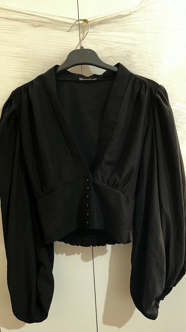 Siyah V Yakalı Düğmeli Kadın Bluz