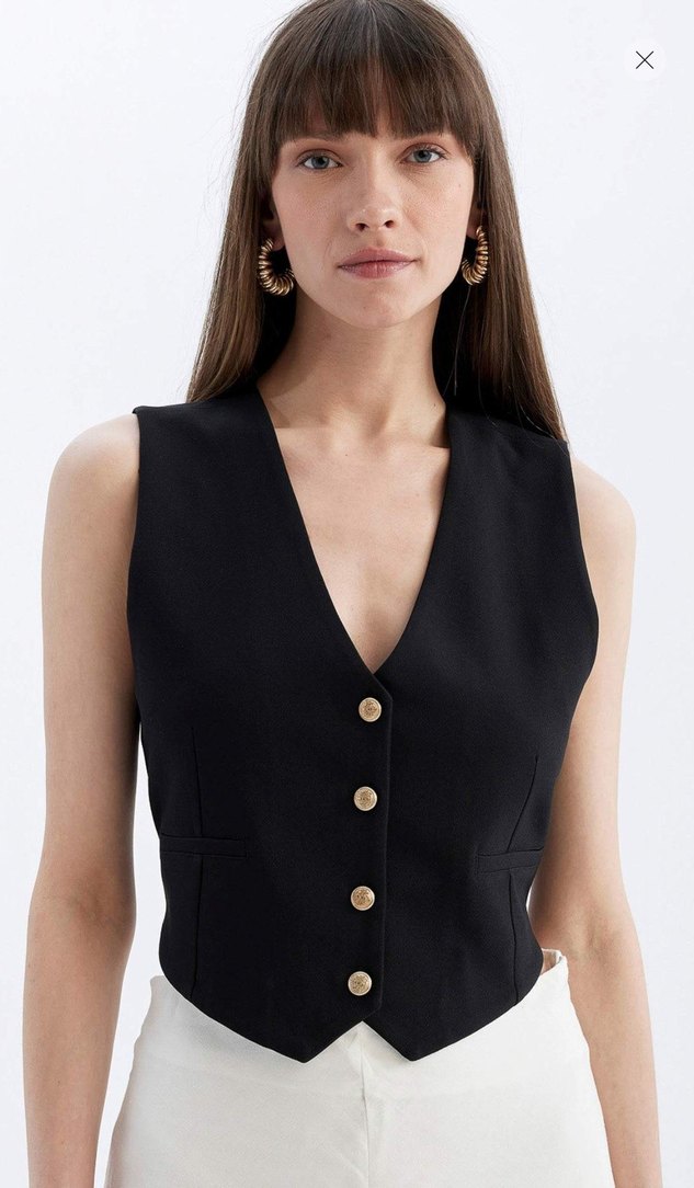 HİÇ GİYMEDİM BEDENİ OLMADI ETİKETLİ DE FACTO MARKA GÜNÜNDE KARGOLANIR. Siyah, V yakalı, düğmeli ve kolsuz kadın yelek. Normal kesim ve parlak dokusu ile ofis ve günlük kullanıma uygundur. ✨