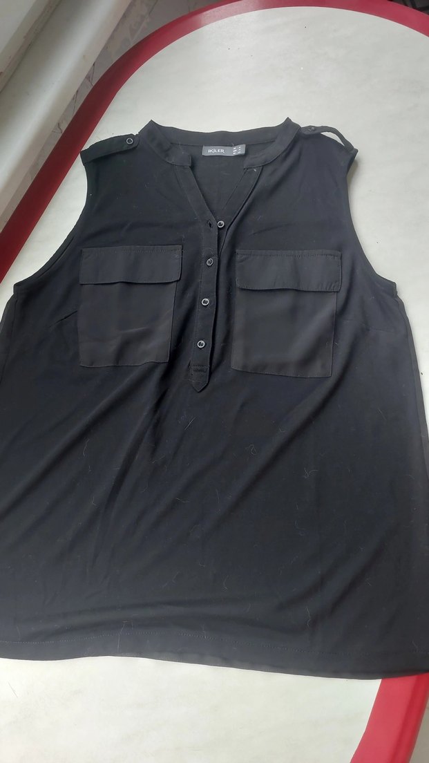 Kolsuz, V yakalı siyah bluz, düğmeli ön kısmı ve iki cep detayıyla rahat bir kalıp sunar. Normal midi boyundadır.