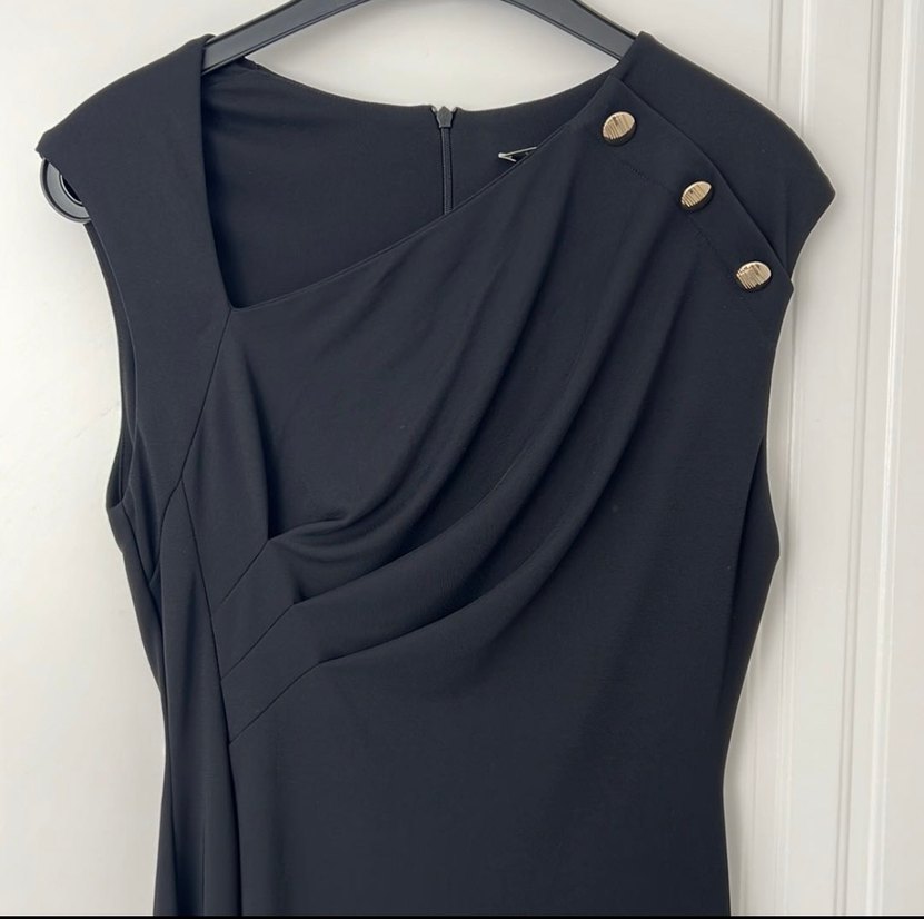 Siyah, kolsuz, V yakalı, düğme detaylı uzun elbise, klasik ve modern çizgilerle ofis ortamına uygundur.