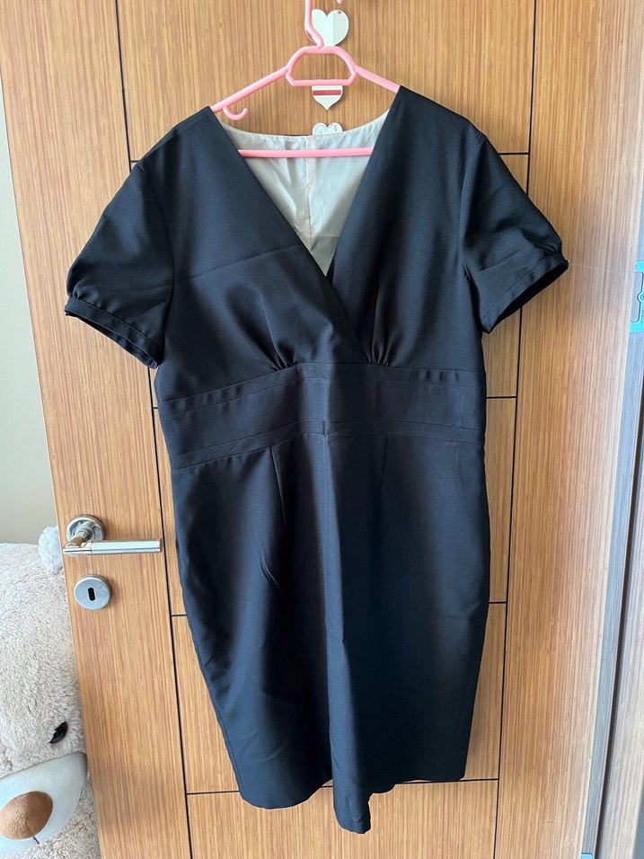 Siyah renkli, V yakalı, kısa kollu elbise . Belden kemerli, midi boyda ve regular fit kesimlidir. Temiz kullanılmıştır defosuzdur