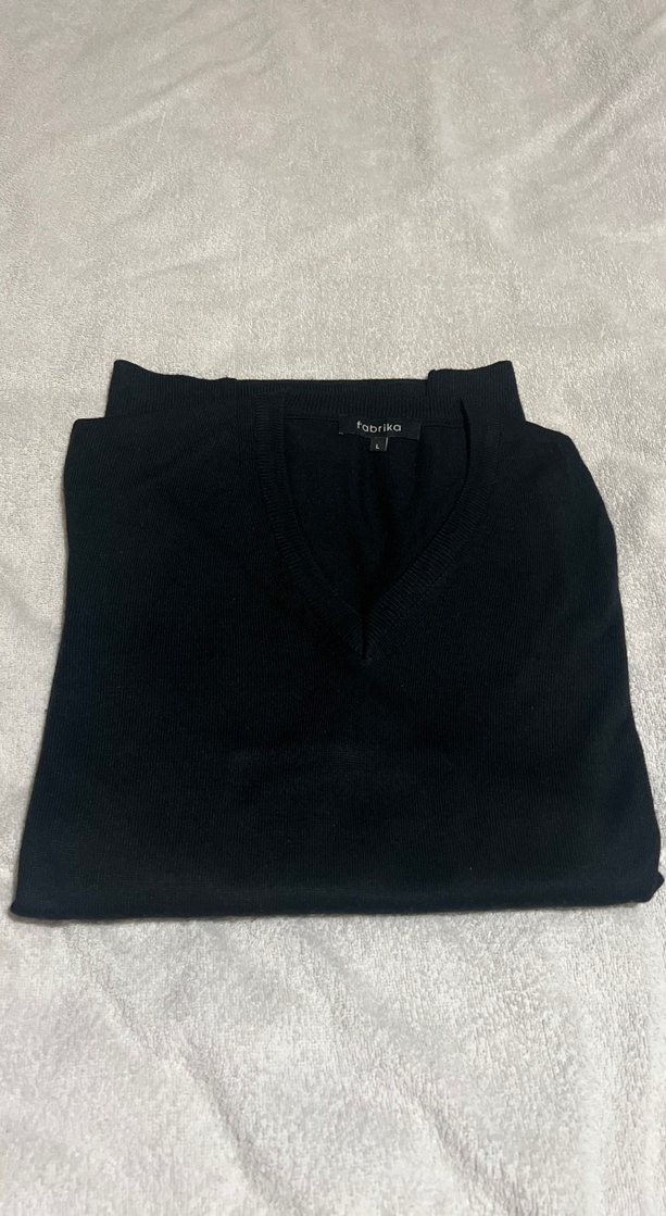 Siyah renk, V yakalı, bol kesim erkek triko, rahat yun kumaştan günlük kullanım için uygun.