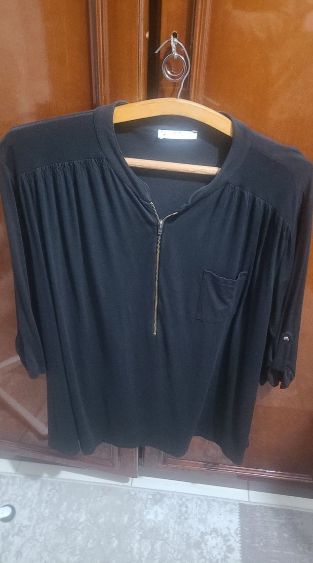 Siyah, V yakalı, fermuarlı, uzun kollu, normal midi uzunlukta, sentetik kumaştan rahat kesim kadın bluz.