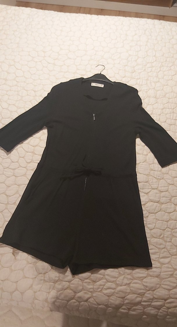 Uzun kollu, V yakalı ve ön fermuarlı siyah kadın şort tulum. Rahat kesim ve midi boyda, yumuşak ve sıcak kumaştan üretilmiştir.