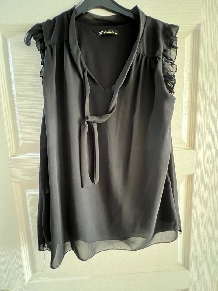 Siyah, kolsuz, V yakalı ve omuzlarda fırfır detaylı bluz. İpek gibi dokulu kumaştan, rahat kesim, günlük kullanım için uygun.