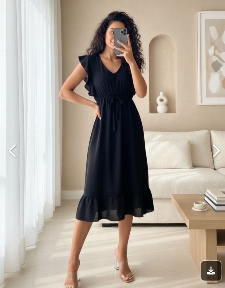 Siyah uzun elbise, V yakalı ve kolsuz tasarıma sahip. Belden büzgülü, fırfırlı etek ucu ve yumuşak sentetik kumaştan üretilmiştir.