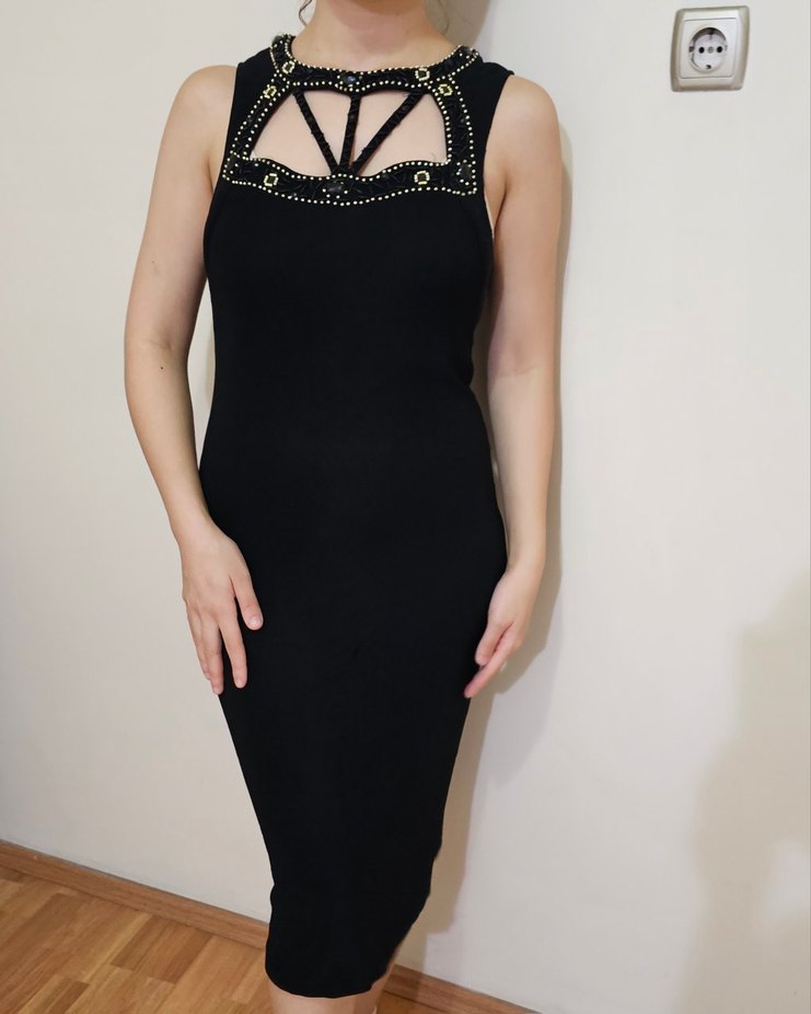 V yakalı, askılı, işlemeli ve boncuk detaylı, siyah, vücuda oturan midi uzunlukta gotik gece elbisesi.