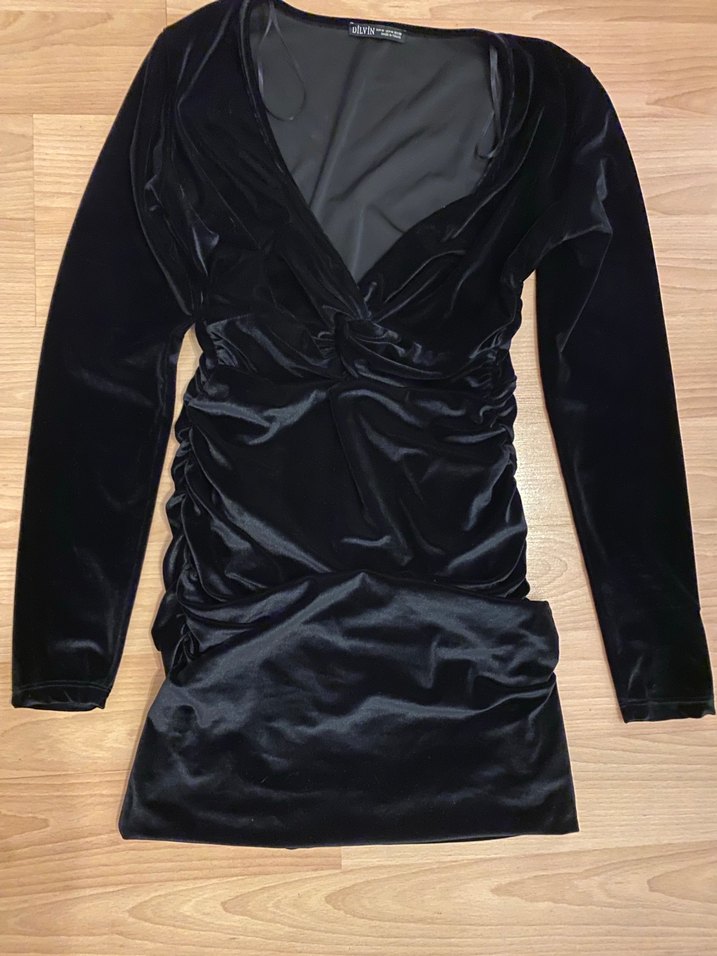 Siyah, V yakalı, uzun kollu ve drapeli, gotik tarzda midi boy kadın abiye elbise. Romantik akşamlar için uygun.
