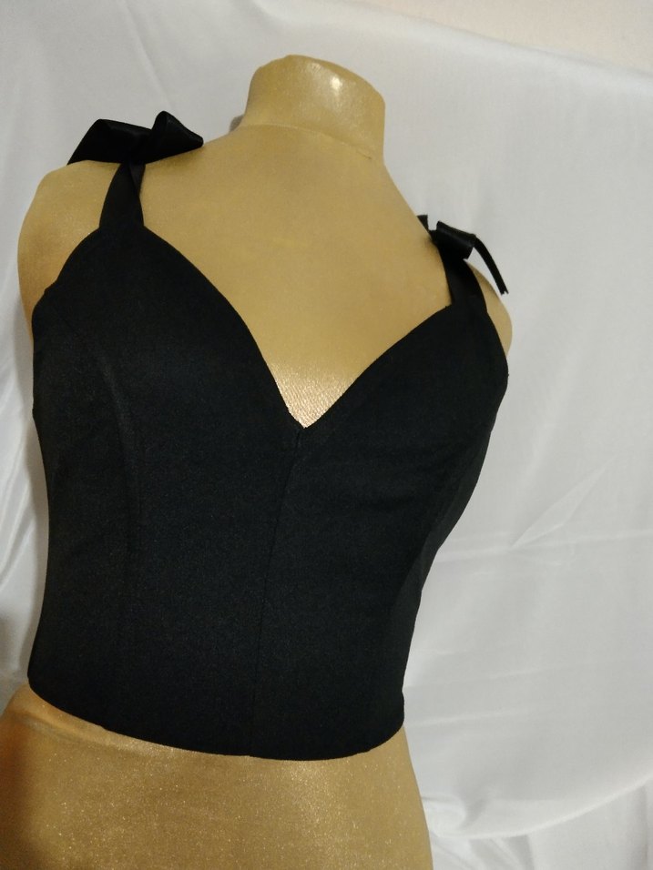 V yakalı, askılı, siyah gotik büstiyer. Sıkı kesim, parti için şık ve iddialı bir parça. ✨