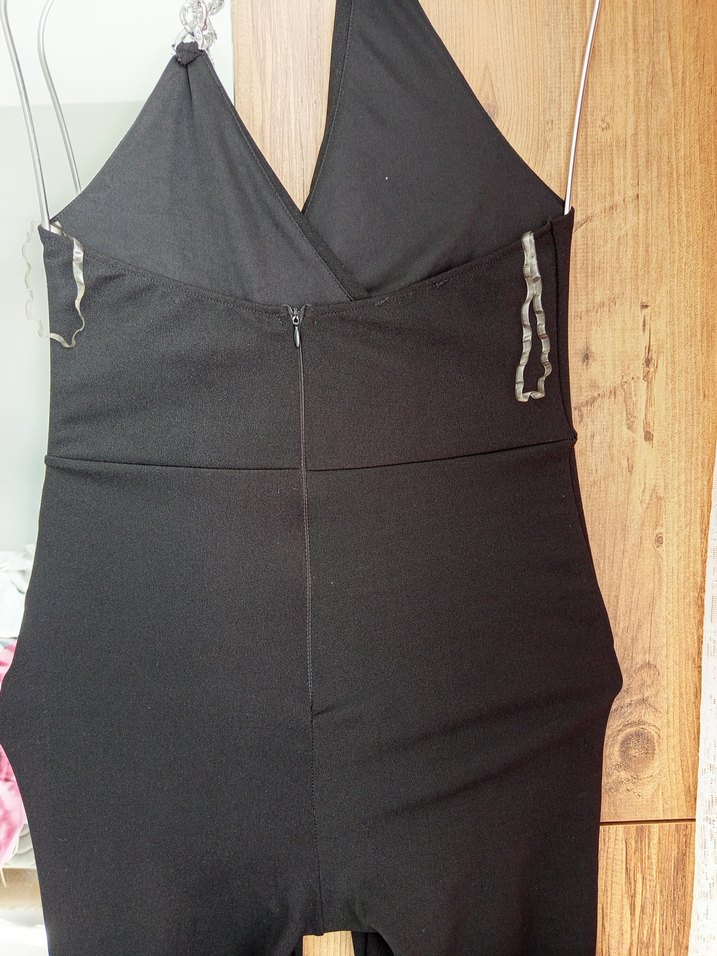 Siyah renkli, V yakalı ve askılı kolları olan, fermuarlı ve vücuda oturan hamile tulumu. Pürüzsüz sentetik kumaştan yapılmıştır, romantik akşamlar için uygundur.