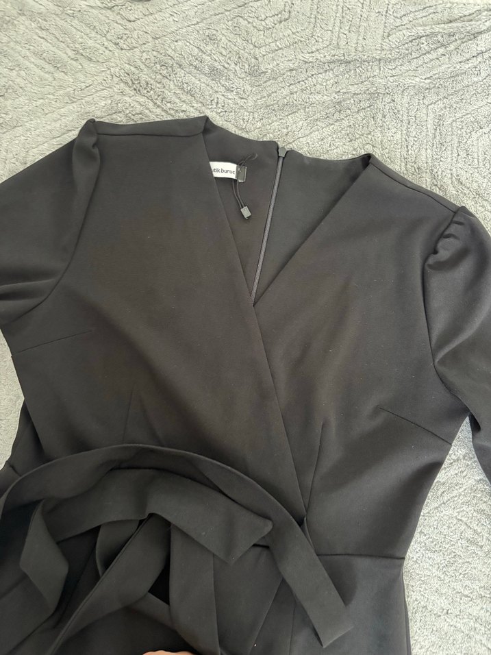 Siyah renkli, V yaka ve yarım kollu , beli oturan normal midi boyda . Desensiz ve şık bir görünüme sahiptir.