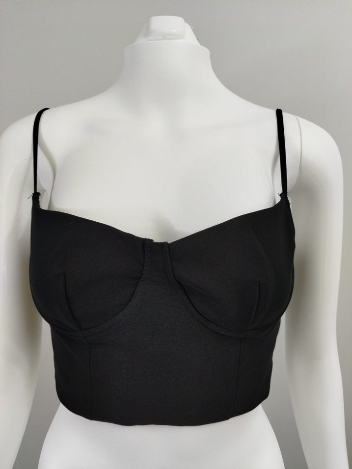 Siyah bustier, V yakalı ve ince askılıdır. Düz ve midi boyda, sentetik kumaştan yapılmıştır. Minimalist goth tarzıyla günlük kullanıma uygundur.