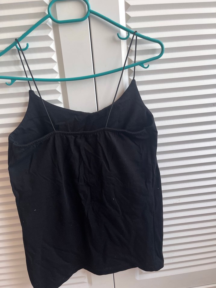 Nefes alabilen keten kumaştan, V yakalı ve ince askılı siyah, vücuda oturan bluz. Günlük sokak stili için uygun.