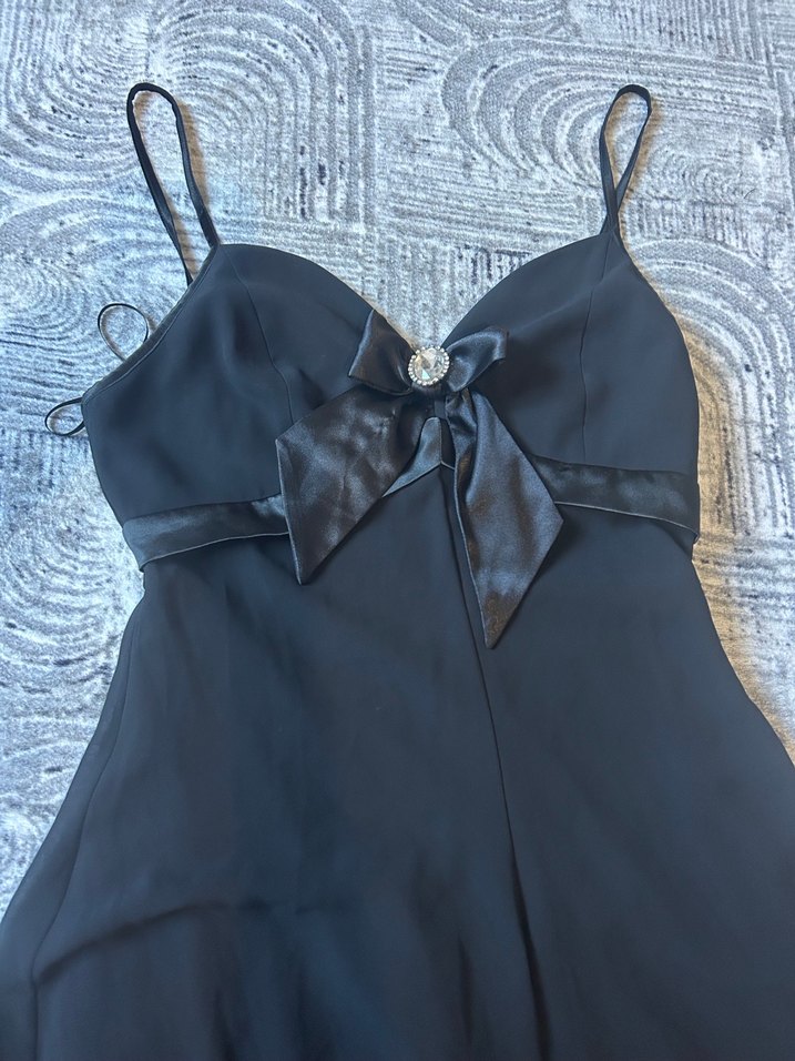 V yakalı ve ince askılı, beli saten fiyonk ve taş detaylı siyah, vücuda oturan tüllü elbise