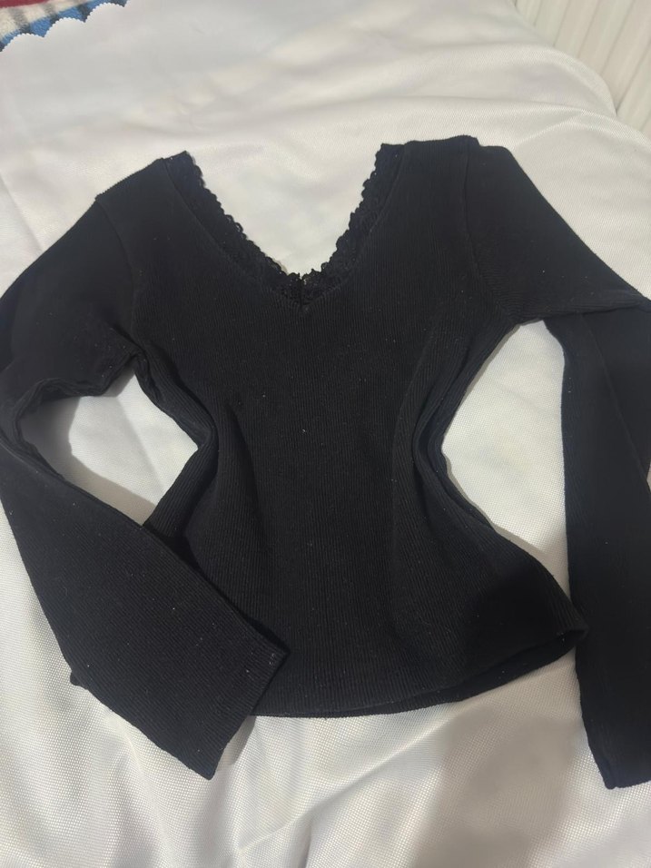V yaka dantelli, uzun kollu, ince triko kumaştan yapılmış siyah, vücuda oturan kadın kazak, günlük kullanıma uygun.
