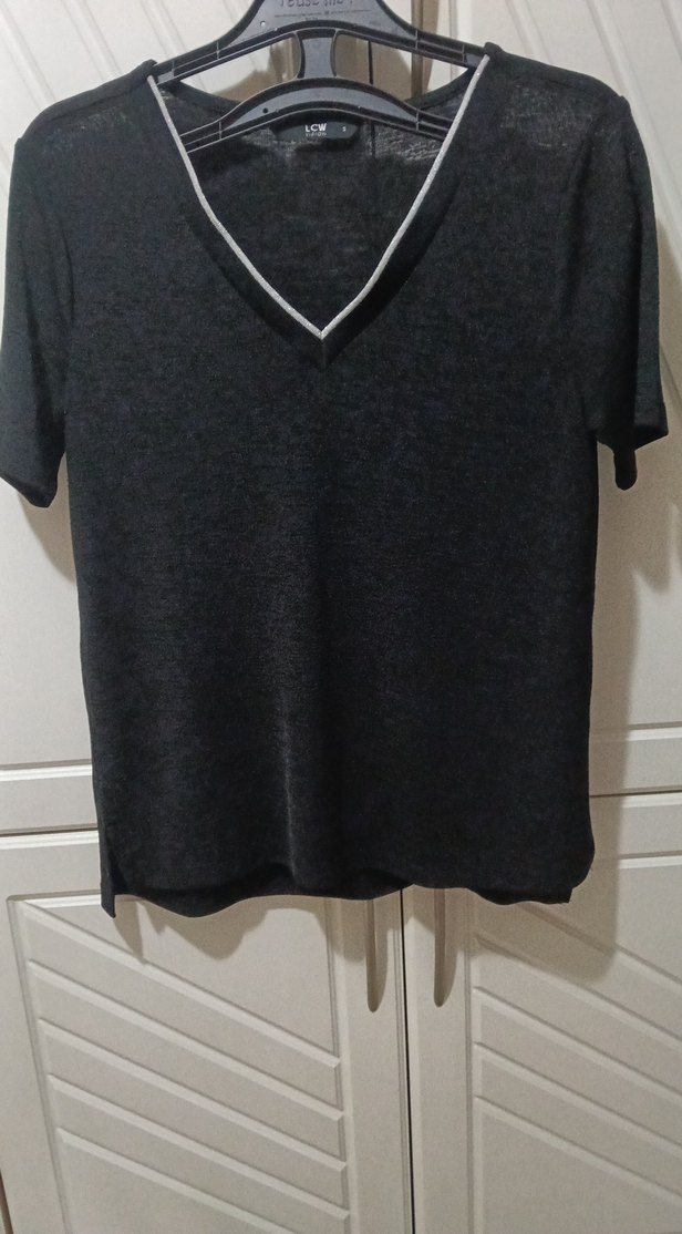V yakalı, kısa kollu, normal kesim siyah kadın bluz hafif transparan Rahat ve şık stil