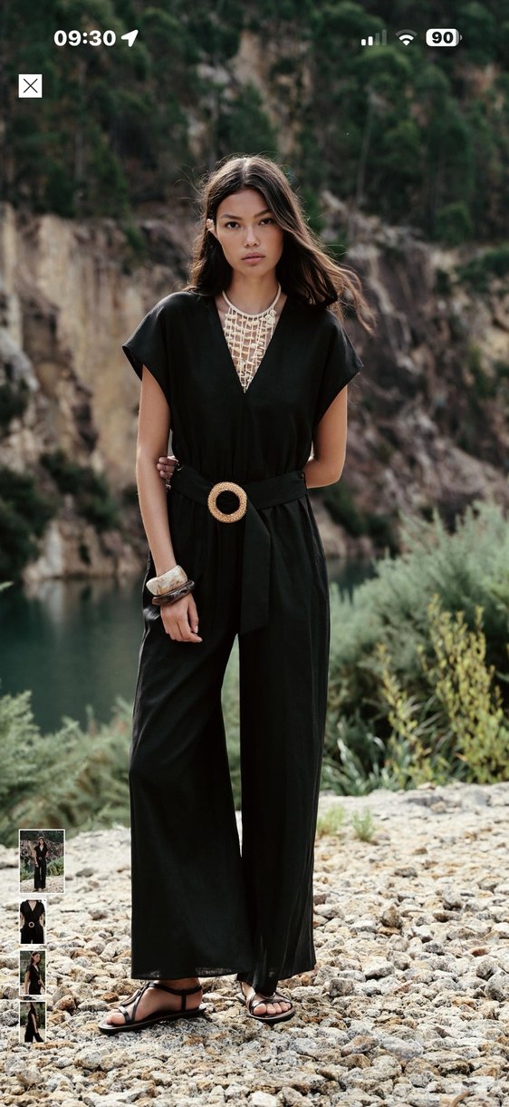 Siyah, V yakalı, bol kesim ve askılı kollu tulum. Bel kemeriyle şekillendirilen, ipeksi dokulu, günlük kullanıma uygun tulum.