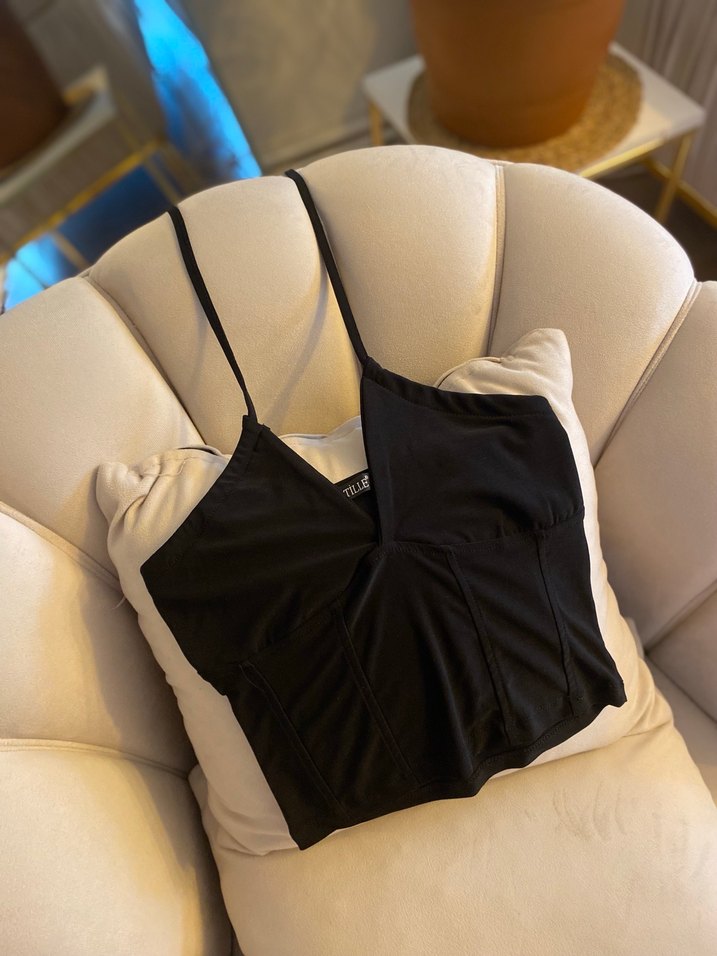 V yaka ve ince askılı, siyah renkli, vücuda oturan sentetik kumaştan yapılmış büstiyer. Günlük kullanıma uygun, zahmetsiz şıklık sunar.