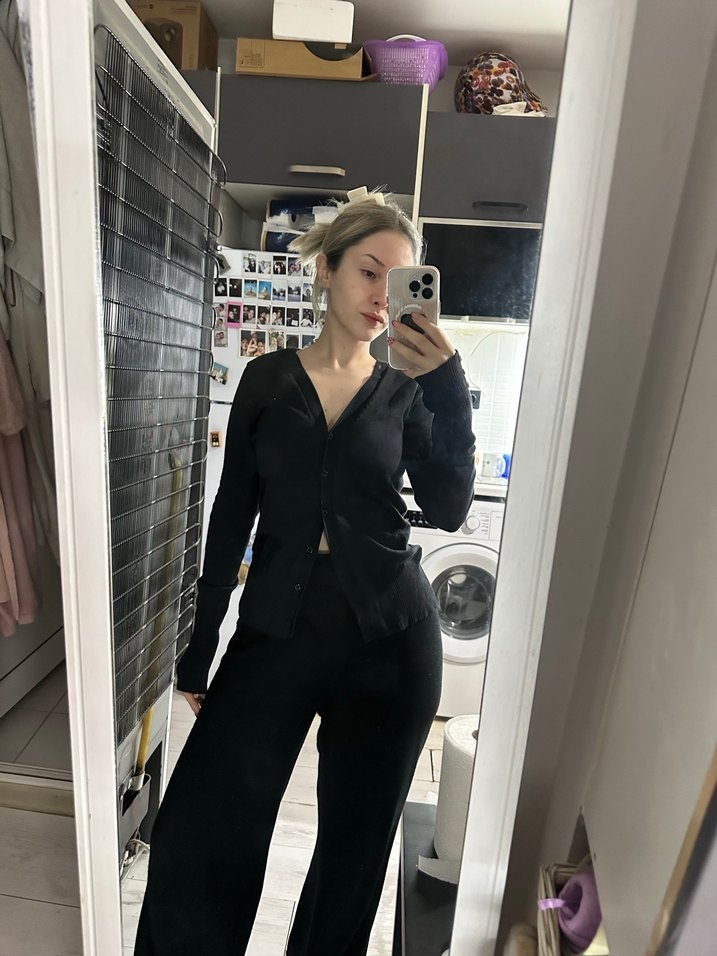 Kadınlar için V yakalı, uzun kollu, ipeksi kumaştan siyah ofis takımı. Normal boy ve rahat kesimle şık bir görünüm sağlar. ✨