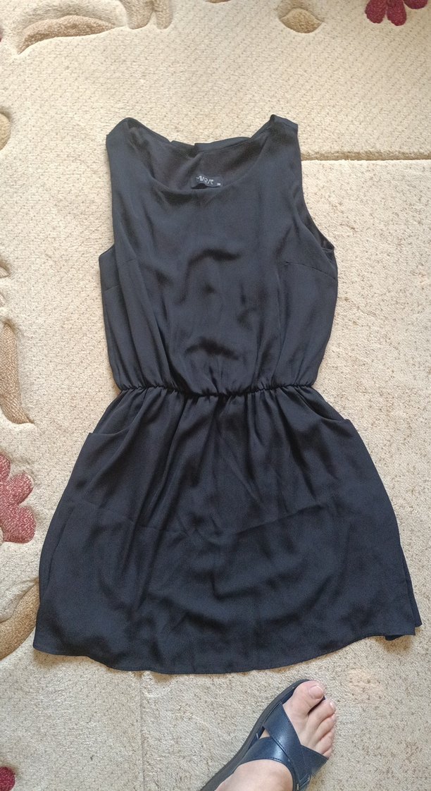 Siyah, v yakalı, kolsuz ve drapeli, satenimsi kumaştan, midi uzunlukta, dar kesim kadın elbisesi. Minimalist goth tarzında, günlük kullanıma uygun. şifon kumaş rahat ve şık