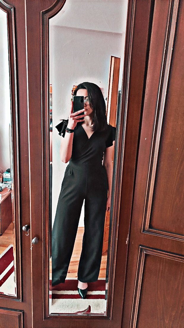 Siyah, V yakalı ve askılı kollu midi tulum, ipeksi kumaştan yapılmıştır. Regular fit kesimiyle günlük kullanıma uygun, zahmetsiz şıklık sunar. isteyenlere ölçü ve fotoğraflar atabilirim