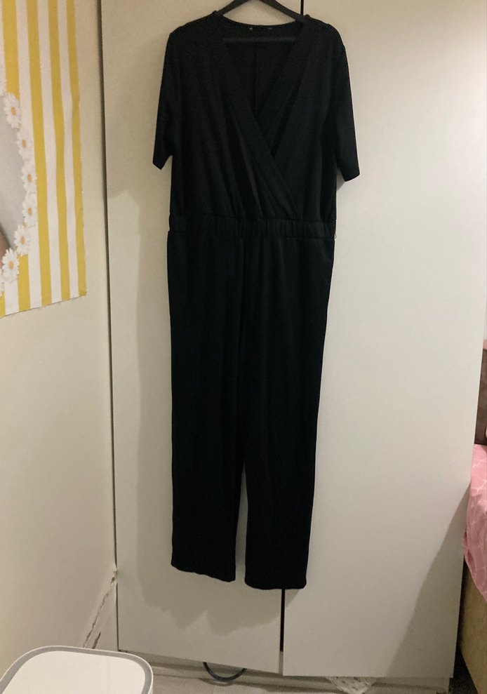 Siyah, V yakalı, kısa kollu midi tulum, rahat kesim ve yumuşak sentetik kumaştan yapılmıştır. Ofis için şık ve rahat bir tercihtir.