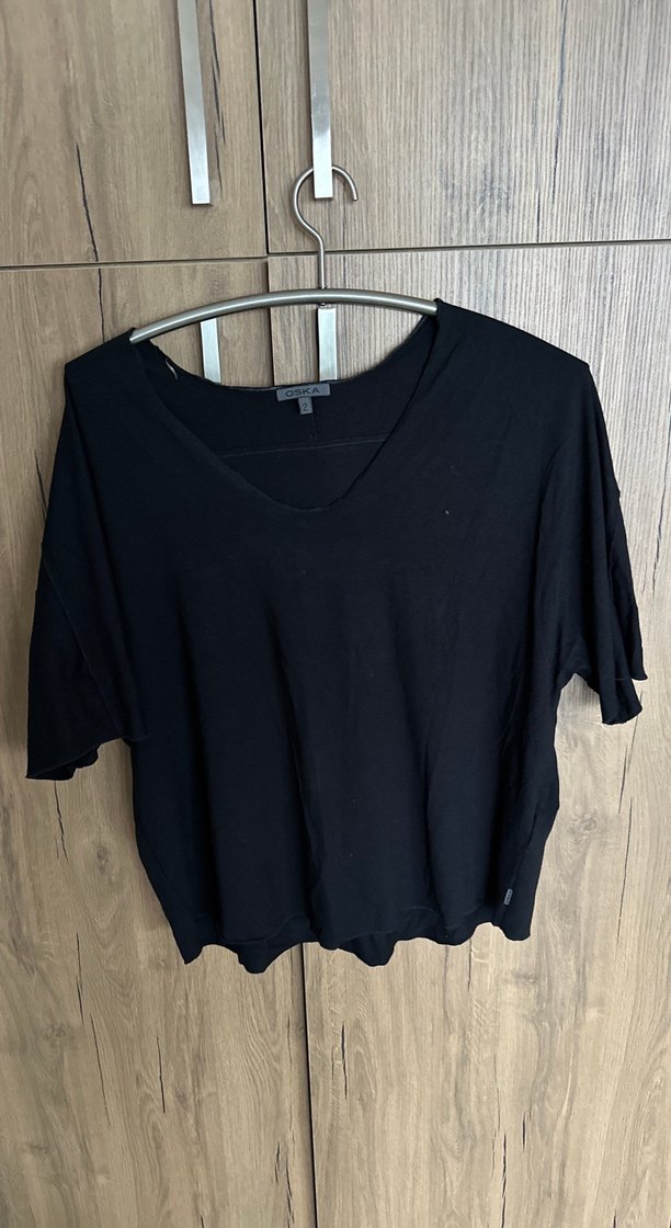 Siyah penye kumaştan, V yakalı, kısa kollu ve rahat kesim kadın tişörtü. Günlük kullanım için şık ve rahat bir sokak stili sunar. Alman malıdır. Çok az giyildi hatasız