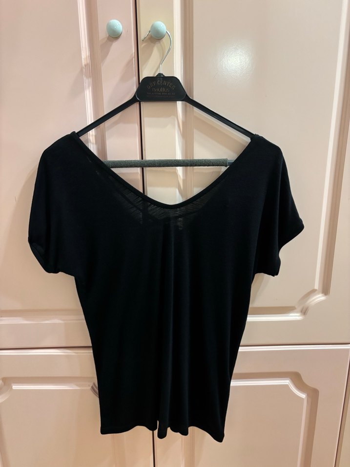 Siyah, V yakalı, kısa kollu, şık sırt dekolteli detaylı. İpeksi dokusuyla minimalist ve gotik tarzda, rahat şıklık sunar. İki kol arası 48 cm Boy 60 cm Yeni ve etiketli