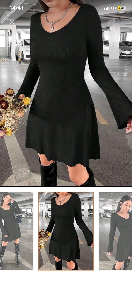 Siyah renkte, uzun kollu, V yakalı ve vücuda oturan kesime sahip triko elbise. Elastik sentetik kumaştan üretilmiş, mini boyda ve sade tasarıma sahip. boy 60 cm