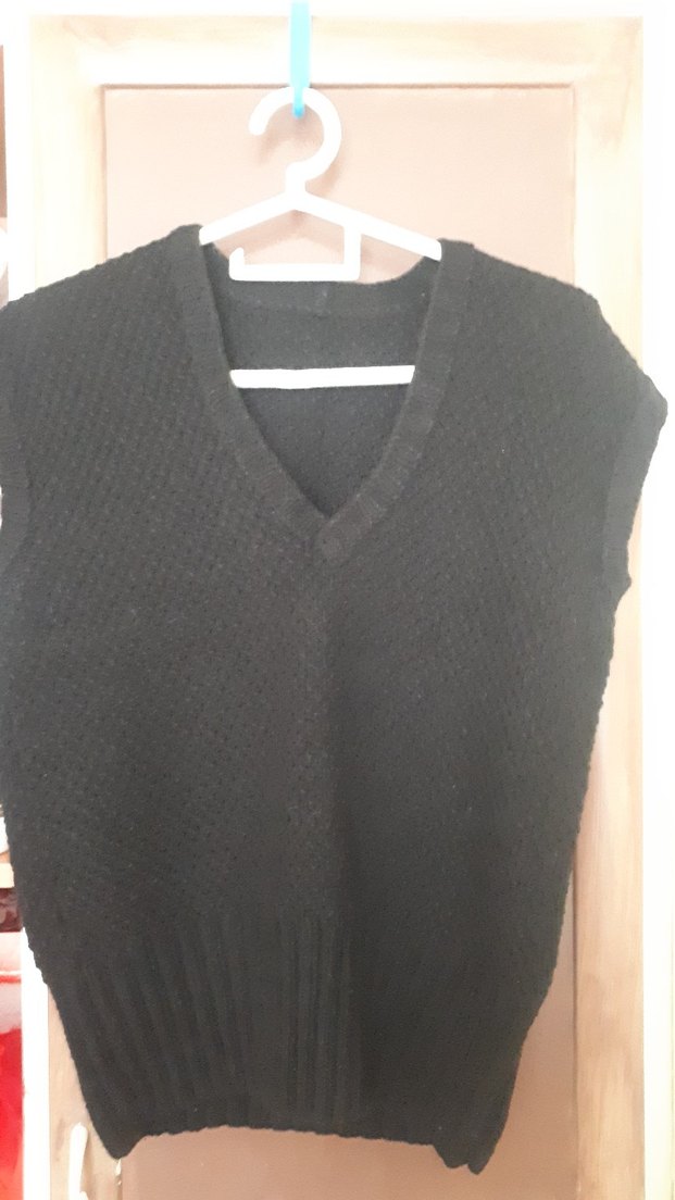 Siyah, V yakalı, örme, kolsuz, bol kesim triko süveter. Rahat ve günlük el ışi çok güzel örulmüştür