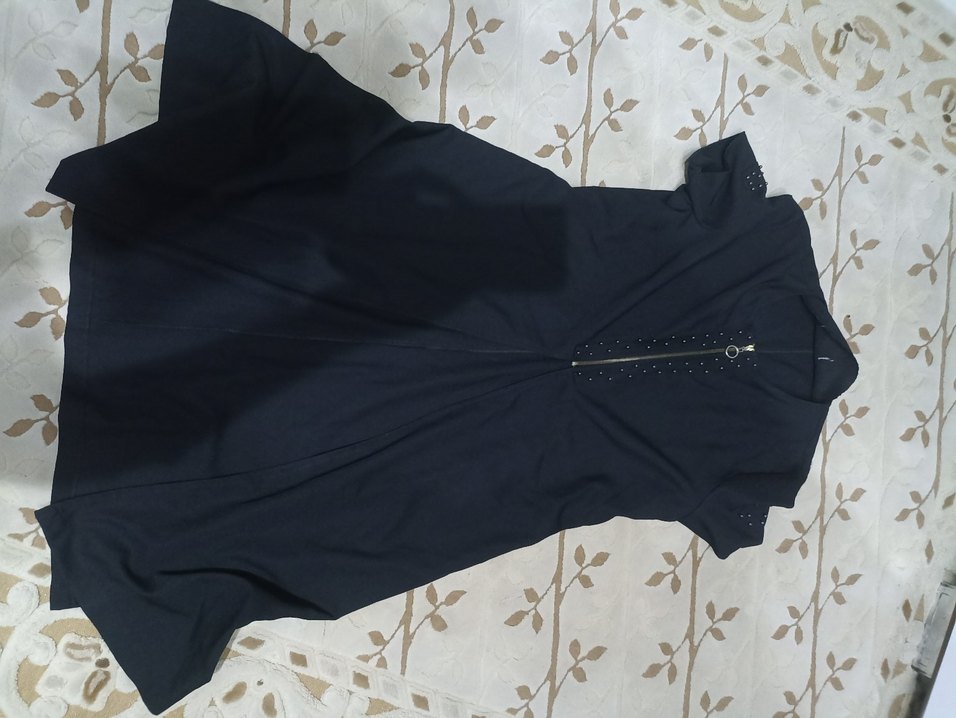 Dar kesim, kolsuz lacivert kadın tunik, uzun boylu ve fermuarlı ön kısmı ile gotik tarzı yansıtıyor. Sentetik kumaştan üretilmiştir.