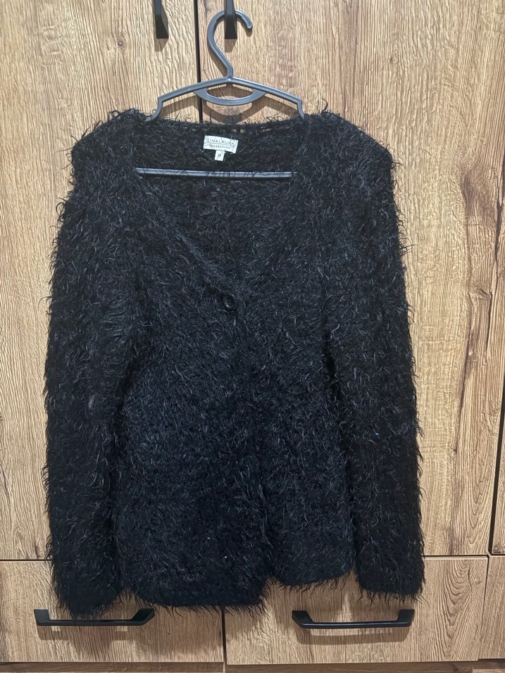 Siyah, yumuşak yünden yapılmış, v yaka ve uzun kollu, midi boy, vücuda oturan kadın hırkası. Ofis için uygun, rahat kürk dokulu.