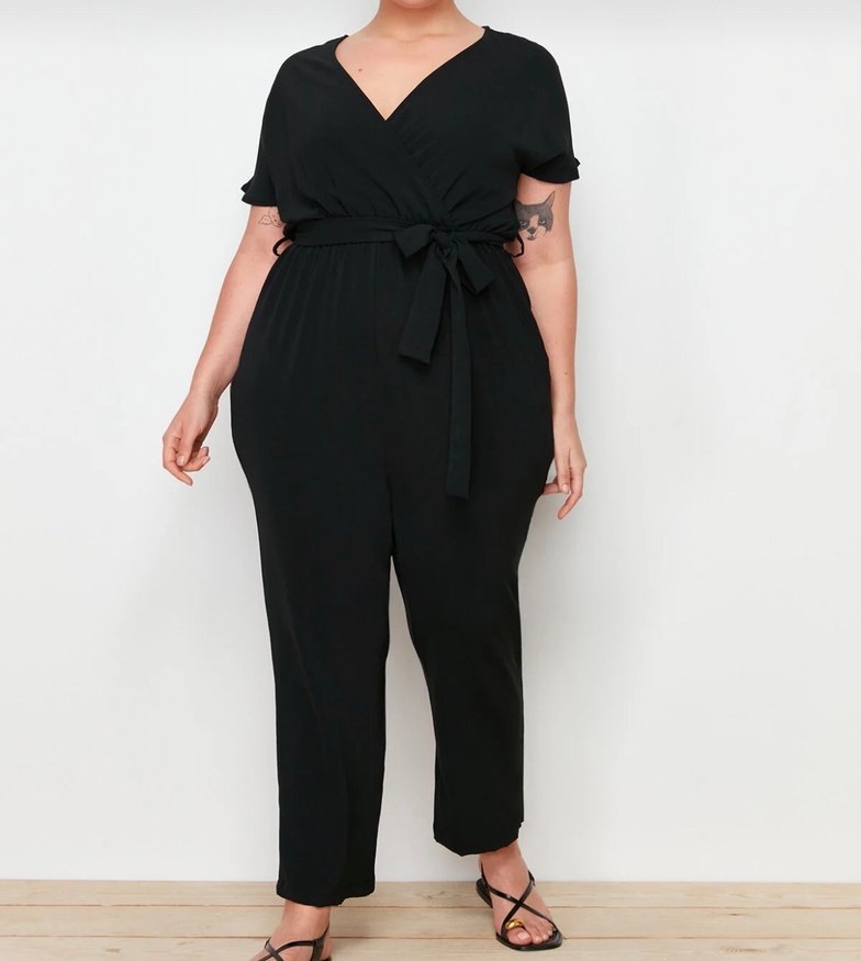 Siyah, kemerli, V yakalı, askılı kollu kadın tulum. İnce kesimli, midi boyda ve sentetik kumaştan üretilmiştir.