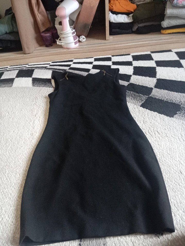 Kolsuz, siyah renkte, V yakalı ve kemerli bu triko elbise, fitted kesimi ve midi boyuyla günlük kullanıma uygundur.