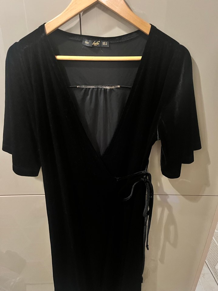 Kemer detaylı, V yakalı, kısa kollu, siyah midi boy sıkı kesim gotik elbise. Romantik akşamlar için uygundur.