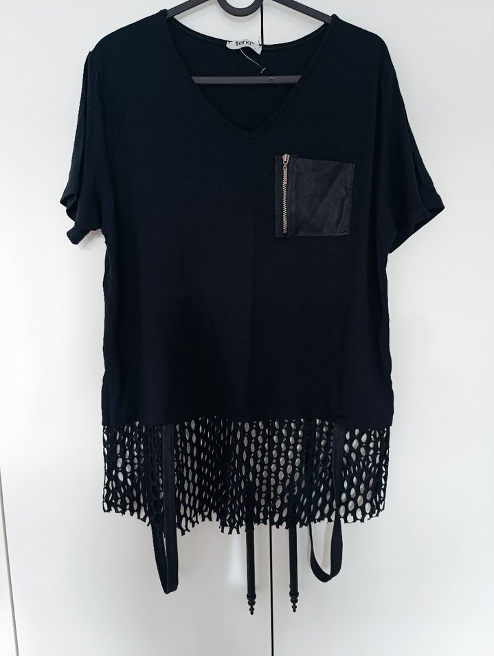 Siyah renkli, V yakalı, bol kesim ve kemerli bel detayına sahip bluz. Fermuarlı cep ve file detaylı etek ucu bulunur, goth ve grunge punk tarzını yansıtır. Ürün hiç kullanılmadı, tarz bluz defosu yoktur kumaşı penyesi yumuşacık çok güzel #bluz #tarztişört